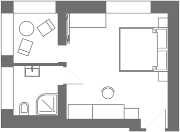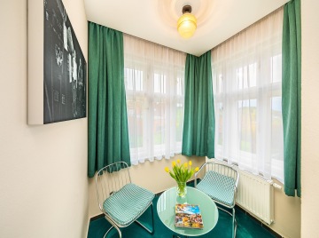A double room situated on the ground floor offers a separated seating corner with a remarkable view of the old city and the castle and chateau complex. Floor area: 22,77 m² / bathroom: 3,95 m²