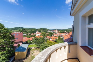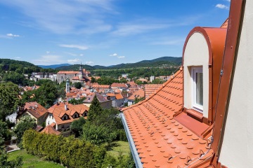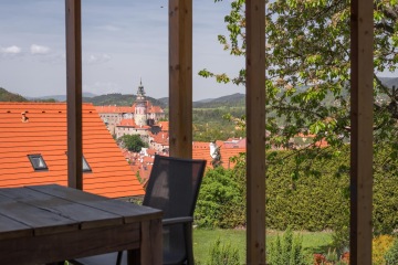 Naše zahrada, zahradní terasa a zastřešená pergola lákají k posezení a pokochání se dechberoucím výhledem na staré město a zámek.