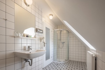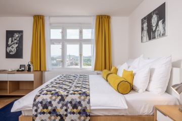 Dvoulůžkový pokoj s fantastickým výhledem na zámek a staré město se nachází ve 2. patře. Podlahová plocha: 20,83 m² / koupelna: 8,70 m²