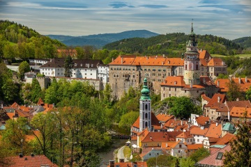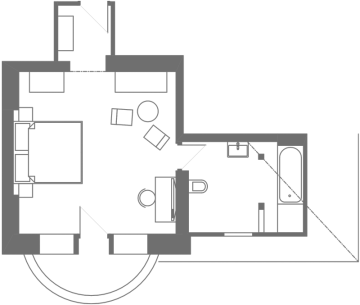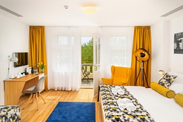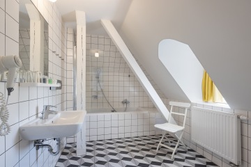 Třílůžkový pokoj se nachází ve 2. patře. Jeho balkon skýtá dechberoucí výhled na zámek, staré město a okolí. Podlahová plocha: 24,68 m² / koupelna: 8,89 m²